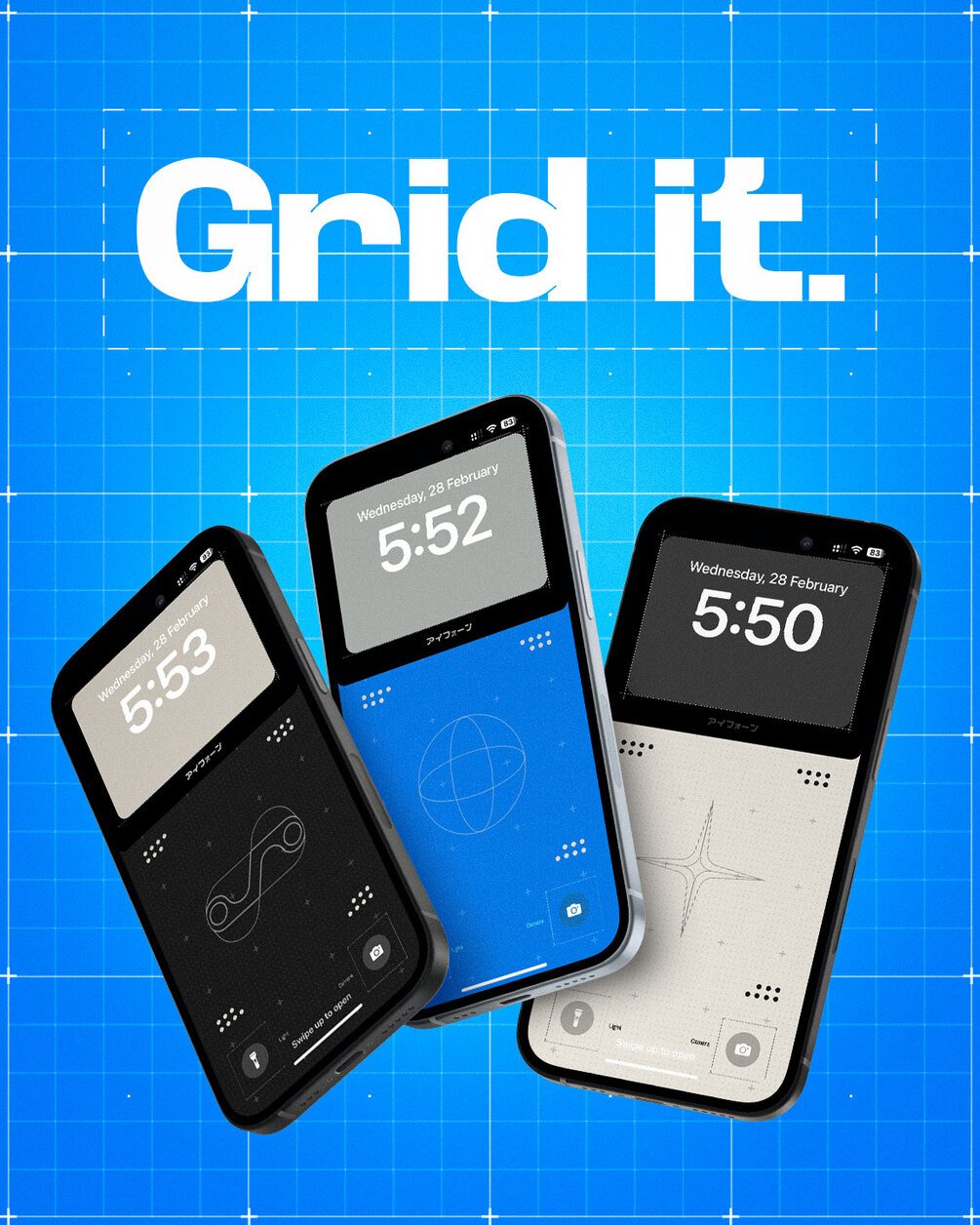Grid It, is a personal collection of wallpapers design for iPhone Users. it utilizes elements from the LockScreen to highlight things like the clock and date with a modern twist.